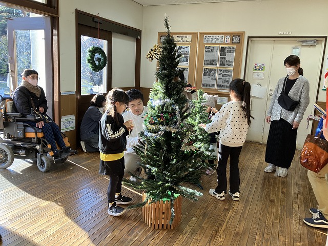 子どもたちが、管理事務所のクリスマスツリーを飾りつけし