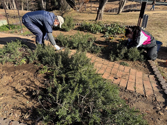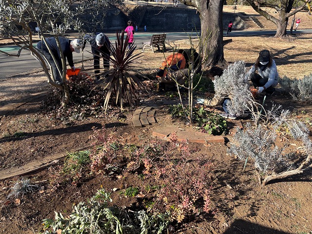 花壇の花がら摘みをしたり、溜った落ち葉を取り除いたりしました。