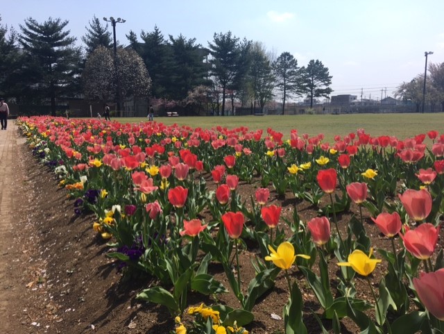 彩の森入間公園の花壇では、昨年の11月にボランティアの方々と植えたチューリップが美しく咲いています。