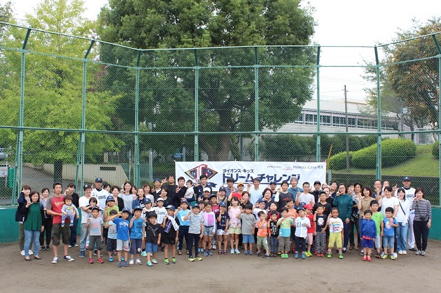 狭山台中央公園の野球場にて、「埼玉西武ライオンズ親子キャッチボール教室」が行われました。