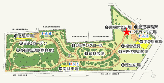 下の公園地図の、赤い★がマンサク、青い★がウメがみられる場所です。
