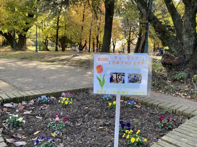 園内の花壇には合計一万本のチューリップの球根が植えられています。