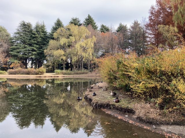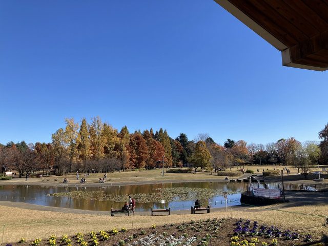 公園では落葉樹の葉が落ちて、落ち葉の絨毯が敷き詰められています。