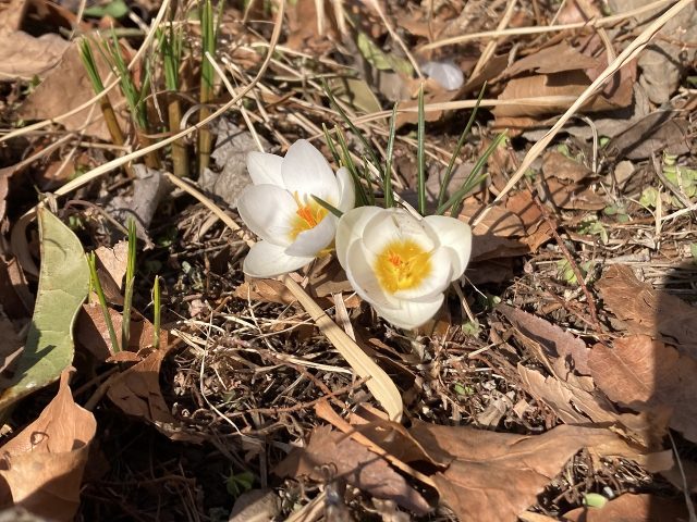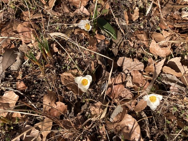 白いクロッカスが咲いています。