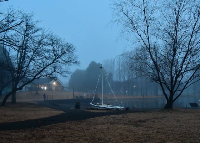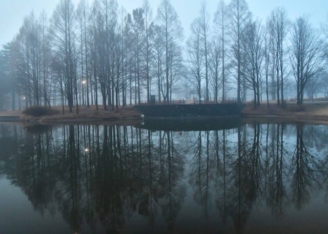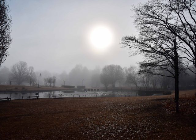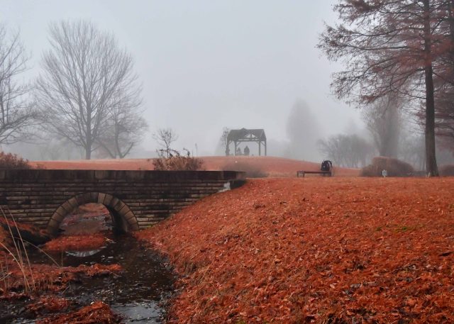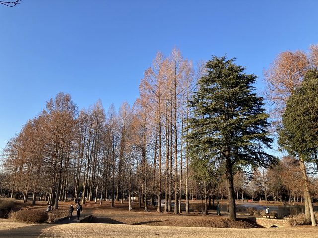 公園では落葉樹の葉が落ちて、落ち葉の絨毯が敷き詰められています。