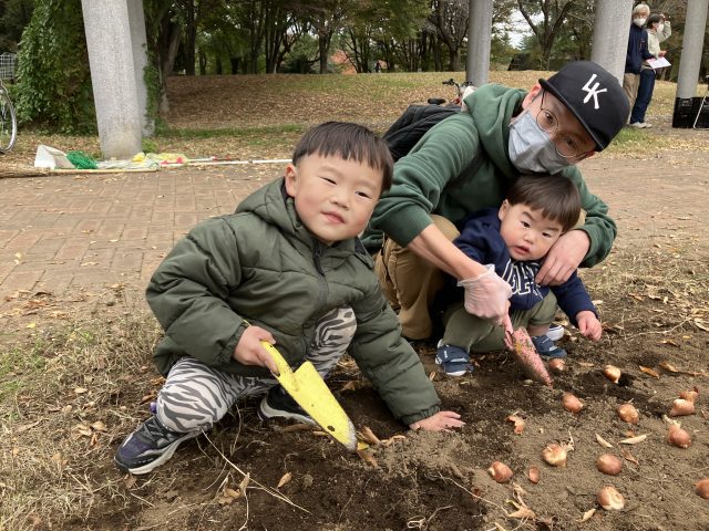 公園内の花壇へチューリップの球根とビオラ(1年草)を植えていただきました。