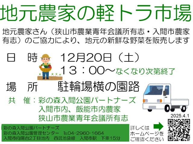 イベント情報 12/20 地元農家の軽トラ市場 ~地場野菜の販売~ 開催予定 第3土曜日は軽トラ市場を開催いたします。 採れたての地場野菜を販売いたします。 冬野菜が並びます! お楽しみにしてください♪ ご来園をお待ちしています。 詳細データ 開催日 12月20日(土曜日) 時間 13:00~ 場所 駐輪場横園路 一覧へもどる