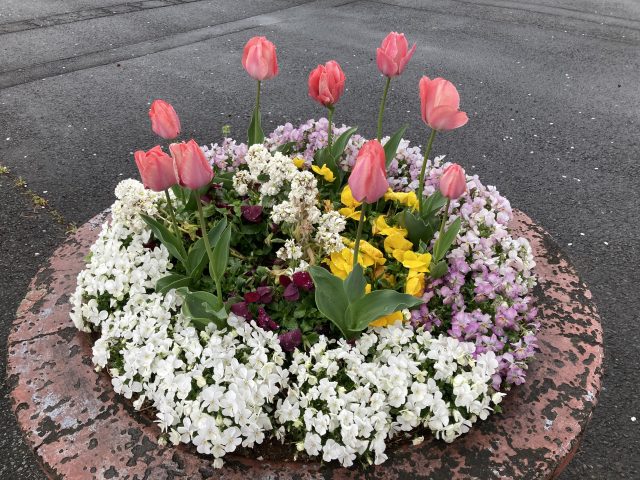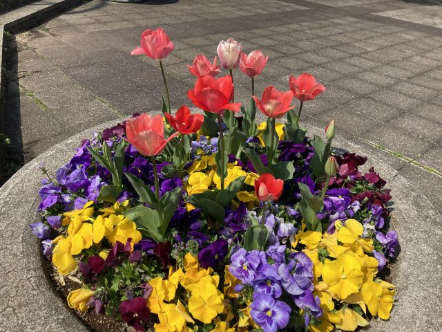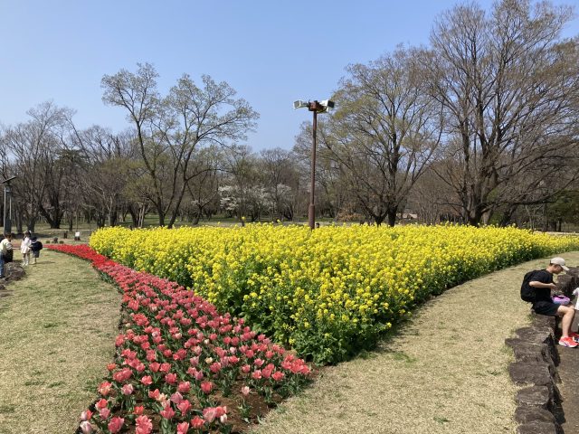 三角花壇付近のジンダイアケボノは、ナノハナやチューリップと一緒に撮影することもできます。