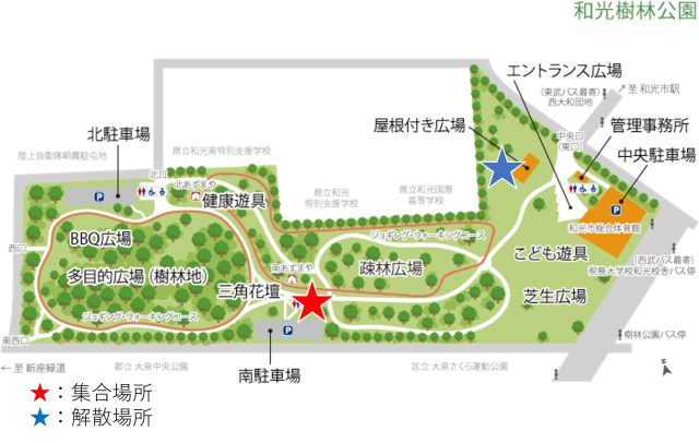 集合場所:南トイレ横 ※解散場所は屋根付き広場奥