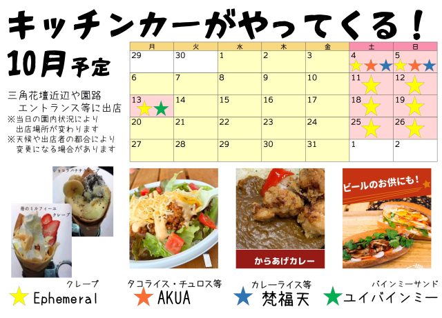 お知らせ 10月のケータリングカーの出店予定 配信日:2025年9月30日 エントランスや三角花壇近辺等に出店します。 当日の園内状況により出店場所が変わりますのでご了承ください。 ※出店内容は変更になる場合があります。 一覧へもどる