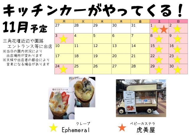 お知らせ 11月のケータリングカーの出店予定 配信日:2025年10月26日 エントランスや三角花壇近辺等に出店します。 当日の園内状況により出店場所が変わりますのでご了承ください。 ※出店内容は変更になる場合があります。 一覧へもどる