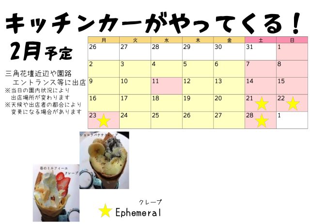 お知らせ 2月のケータリングカーの出店予定 配信日:2026年1月16日 エントランスや三角花壇近辺等に出店します。 当日の園内状況により出店場所が変わりますのでご了承ください。 ※出店内容は変更になる場合があります。 一覧へもどる