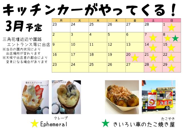 お知らせ 3月のケータリングカーの出店予定 配信日:2026年2月28日 エントランスや三角花壇近辺等に出店します。 当日の園内状況により出店場所が変わりますのでご了承ください。 ※出店内容は変更になる場合があります。 一覧へもどる