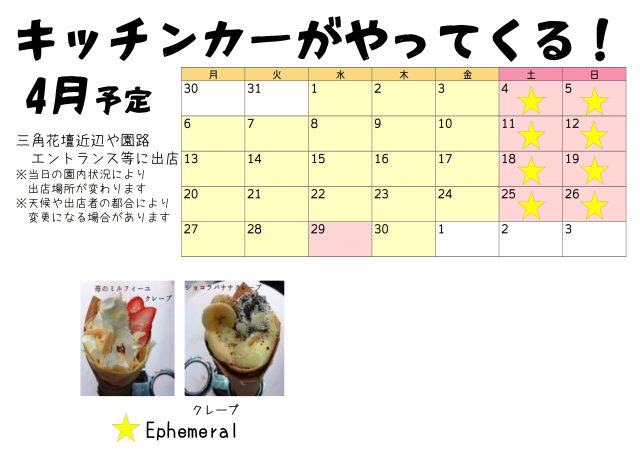 お知らせ 4月のケータリングカーの出店予定 配信日:2026年3月22日 エントランスや三角花壇近辺等に出店します。 当日の園内状況により出店場所が変わりますのでご了承ください。 ※出店内容は変更になる場合があります。 一覧へもどる