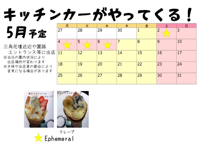 お知らせ 5月のケータリングカーの出店予定 配信日:2026年4月19日 エントランスや三角花壇、エントランス付近に出店します。 当日の園内状況により出店場所が変わります。あらかじめご了承ください。 ※出店内容は変更になる場合がございます。 一覧へもどる